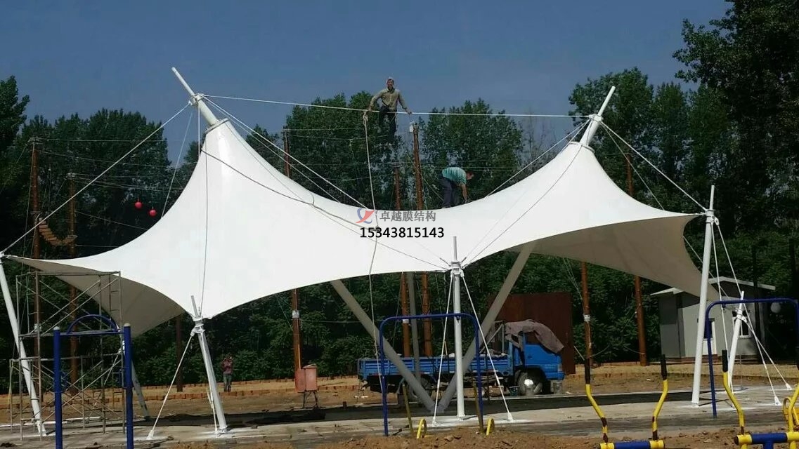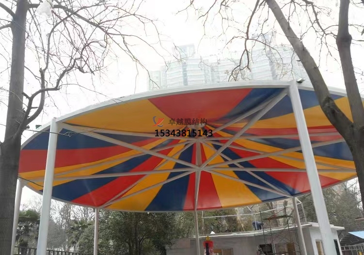 膜結(jié)構(gòu)遮陽(yáng)棚結(jié)構(gòu)設(shè)計(jì):其結(jié)構(gòu)設(shè)計(jì)主要從找形分析、荷載計(jì)算、支撐體系、形態(tài)創(chuàng)新、膜材選擇等方面出發(fā)。找形分析,通過(guò)力密度法、動(dòng)力松弛法或非線性有限元法確定膜材空間形態(tài),確保合理受力分布與美學(xué)效果。荷載計(jì)算,重點(diǎn)考慮風(fēng)荷載、雪荷載及自重,采用有限元法進(jìn)行靜力與動(dòng)力分析,避免膜面受壓或局部應(yīng)力集中。支撐體系,選擇合適的支撐結(jié)構(gòu)形式,如鋼結(jié)構(gòu)、鋁合金結(jié)構(gòu)等。支撐結(jié)構(gòu)應(yīng)具有足夠的強(qiáng)度、剛度和穩(wěn)定性,能夠可靠地承受膜面?zhèn)鱽?lái)的荷載。常見(jiàn)的支撐方式有立柱支撐、懸索支撐、框架支撐等。形態(tài)創(chuàng)新,結(jié)合曲線、弧線等元素,設(shè)計(jì)可調(diào)節(jié)遮陽(yáng)棚,適應(yīng)不同光照與使用需求。半透明膜材與光影結(jié)合,營(yíng)造柔和氛圍,兼具遮陽(yáng)與景觀功能。膜材選擇,根據(jù)遮陽(yáng)棚的使用要求和環(huán)境條件,選擇合適的膜材。膜材應(yīng)具有良好的耐久性、抗紫外線性能、自潔性能、防火性能等。常用的膜材有聚四氟乙烯(PTFE)膜、聚酯纖維基 PVC 膜、乙烯 - 四氟乙烯共聚物(ETFE)膜等。