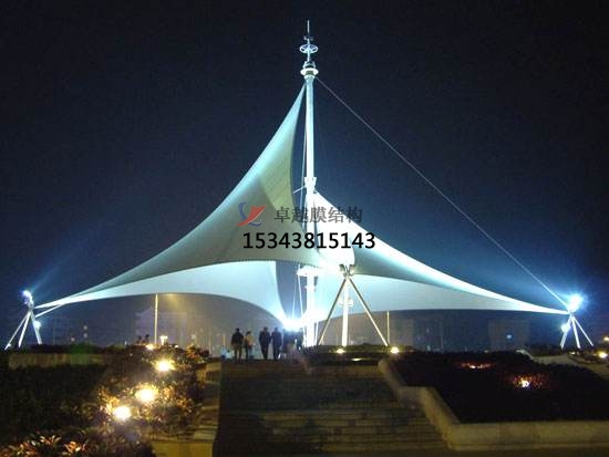 一個城市的中心區(qū)反映一個城市的地理風貌和民族風情,同時,也是一個城市文化發(fā)展程度的標志。而景觀設(shè)計要求其具有廣泛的可讀性、雅俗共賞,既有超凡脫俗的藝術(shù)價值,又能使大眾喜聞樂見與大眾息息相通。張拉膜以其鮮明的個性和標識性,應(yīng)用于城市小品設(shè)計中。