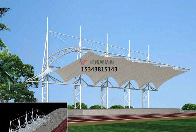 看臺膜結構是用高強度柔性薄膜材料經(jīng)受其它材料的拉壓作用而形成的穩(wěn)定曲面,能承受一定外荷載的空間結構形式。 其造型自由、輕巧、美,充滿力量感,阻燃、制作簡易、安裝快捷、節(jié)能易于、使用安全等優(yōu)點.因而使它在世界各地受到廣泛應用。