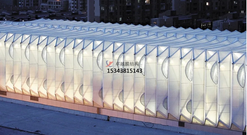 膜結(jié)構(gòu)使得建筑輕盈感十足,膜材料的良好透性使得建筑界面透光而不透視。由于該材料(ETFE)氣枕在陽光底下富有通透感光線可以通過漫射和折射進(jìn)入界面,讓膜結(jié)構(gòu)建筑呈現(xiàn)出朦朧夢(mèng)幻之美。
