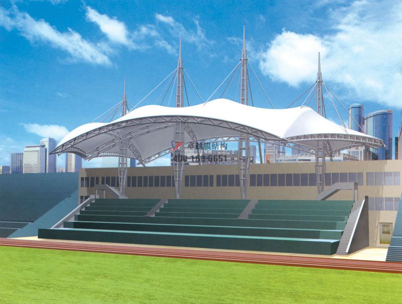 膜結(jié)構(gòu)看臺在體育設(shè)施上主要應(yīng)用在學(xué)校操場運動看臺或主席臺屋頂,另外大型體育場館看臺膜結(jié)構(gòu)屋頂也屢見不鮮。看臺造型般由貝殼形峰膜及部張拉膜組成,形式新穎活潑。膜結(jié)構(gòu)看臺將鋼架、索、膜巧妙結(jié)合,通過薄膜、膜邊索、脊索、谷索、拉索、拉桿及定的格構(gòu)梁來穩(wěn)定。膜頂平滑過渡,結(jié)構(gòu)美觀、輕巧、整體造型相互輝映,別具格,接下來我們起來看看膜結(jié)構(gòu)看臺的設(shè)計是怎么樣的。