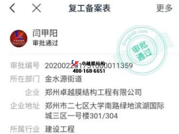 今天你復(fù)工了嗎?我們卓越膜結(jié)構(gòu)工程有限公司經(jīng)過層層審批,更終批準(zhǔn)于2020年3月2號正式復(fù)工。
