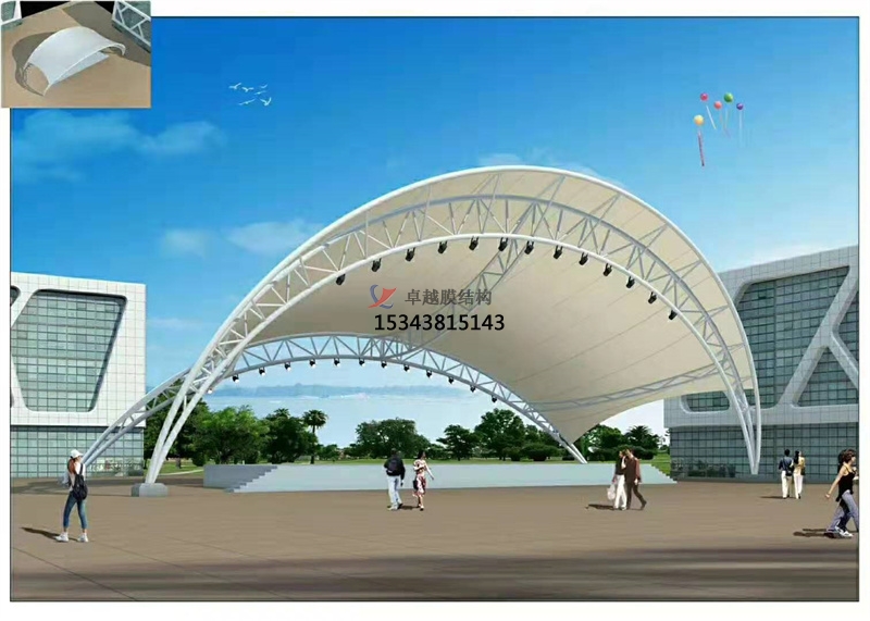 四、舞臺(tái)膜結(jié)構(gòu)具有膜結(jié)構(gòu)建筑的所有優(yōu)點(diǎn):外觀雅致飄逸,空間開(kāi)闊靈透、結(jié)構(gòu)輕致、透光阻燃、自潔性好、安裝快、節(jié)能降耗、造價(jià)適中、維修便捷。