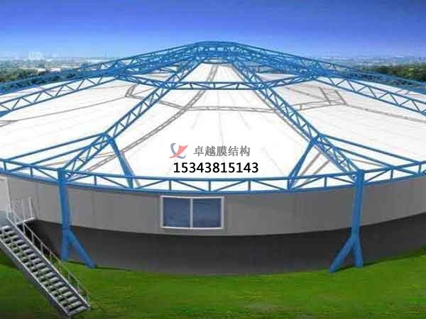 2、我公司利用膜結(jié)構(gòu)的輕巧,別致的造型建造各種半封閉,全封閉的不行空間;污水池反吊膜結(jié)構(gòu)中的高強度柔韌薄膜稱膜材,它是一種耐腐蝕、耐高溫、耐久用、高強度的樹脂類涂層織物,由多種復(fù)合PVC樹脂涂層刀刮成型,具有質(zhì)地柔韌、厚度小、重量輕、透光性好的特點。對自然光吸收和透射能力、阻燃,具有良好的耐久、防火、氣密等特性;表面經(jīng)過特氟龍?zhí)幚砘蚨趸伩估匣幚恚哂休^高的自清潔性能。下面就大家介紹一下我公司在泰安市地區(qū)完成的部分污水池膜結(jié)構(gòu)封閉項目。