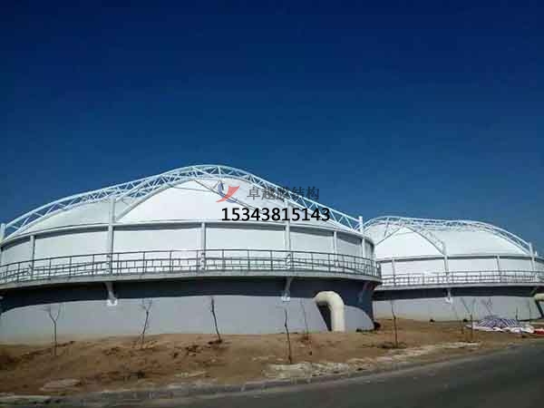 2、我公司利用膜結(jié)構(gòu)的輕巧,別致的造型建造各種半封閉,全封閉的不行空間;污水池反吊膜結(jié)構(gòu)中的高強(qiáng)度柔韌薄膜稱膜材,它是一種耐腐蝕、耐高溫、耐久用、高強(qiáng)度的樹脂類涂層織物,由多種復(fù)合PVC樹脂涂層刀刮成型,具有質(zhì)地柔韌、厚度小、重量輕、透光性好的特點(diǎn)。對自然光吸收和透射能力、阻燃;,具有良好的耐久、防火、氣密等特性;表面經(jīng)過特氟龍?zhí)幚砘蚨趸伩估匣幚?,具有較高的自清潔性能。下面就大家介紹一下我公司在泰安市地區(qū)完成的部分污水池膜結(jié)構(gòu)封閉項目。