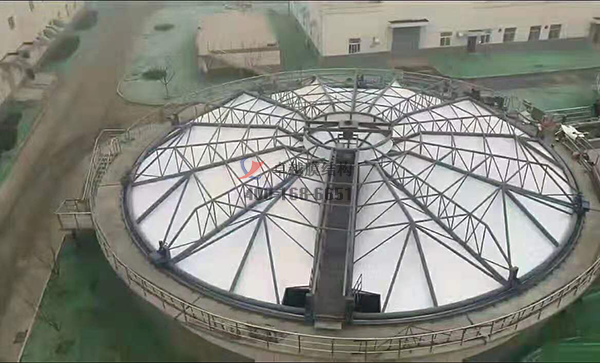 1.該項目是嘉峪關(guān)污水廠污水池加蓋工程,所含污水池總面積共計為1001m²,采用隨動式鋼架反吊膜.