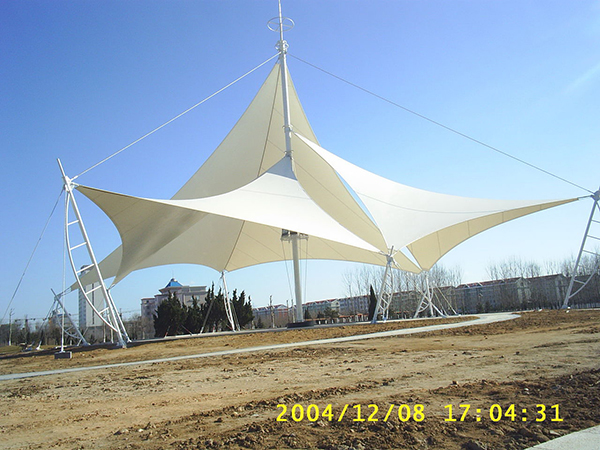 張拉膜結構是指通過拉索將膜材料張拉于結構上而形成的,張拉膜結構也可稱為張拉式索膜結構,是由穩(wěn)定的空間雙曲張拉膜面、支承桅桿體系、支承索和邊緣索等構成的結構體系。